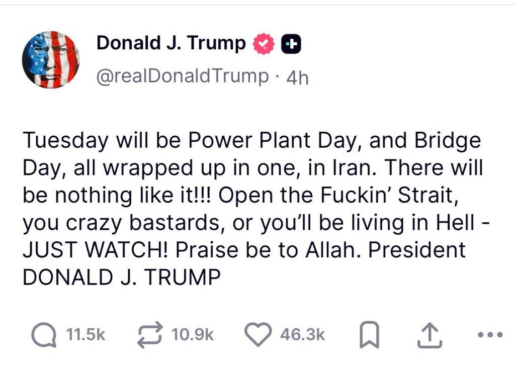 Since the start of the US/Israel war against Iran started in February, attacks on civilian infrastructure have been common. The US’ President and Secretary of Defense have explicitly called for destruction of civilian targets and no quarter for the Iranians. Both of these are war crimes. During the early hours of Easter 2026, Trump openly admitted that he will be committing war crimes in two days with “Power Plant Day and Bridge Day” and that the Iranians “will be living in hell”.